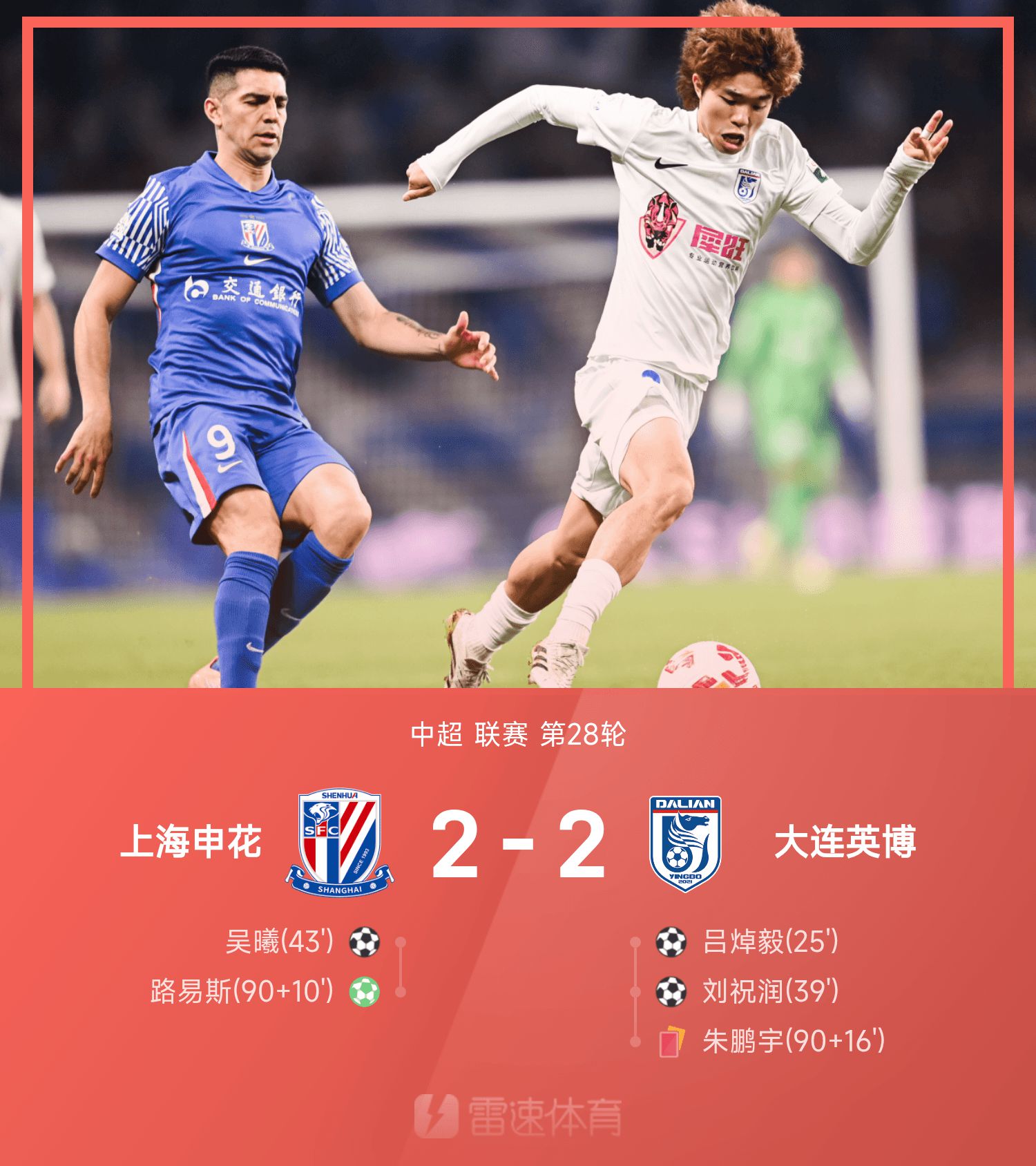 6686体育官网10月26日讯 25赛季中超联赛事第28轮,上海申花2-2战平大连英博。上半场,吕焯毅打出世界波为大连英博取得领跑位,刘祝润扩展领跑位优势,吴曦为申花扳回1球;下半场,视频裁判多达4次介入,吴曦和汪海健击中横梁,补时阶段,视频裁判介入吴曦造点胜利,路易斯主罚完成绝平,上海申花最终2-2战平大连英博,距离榜首2分。