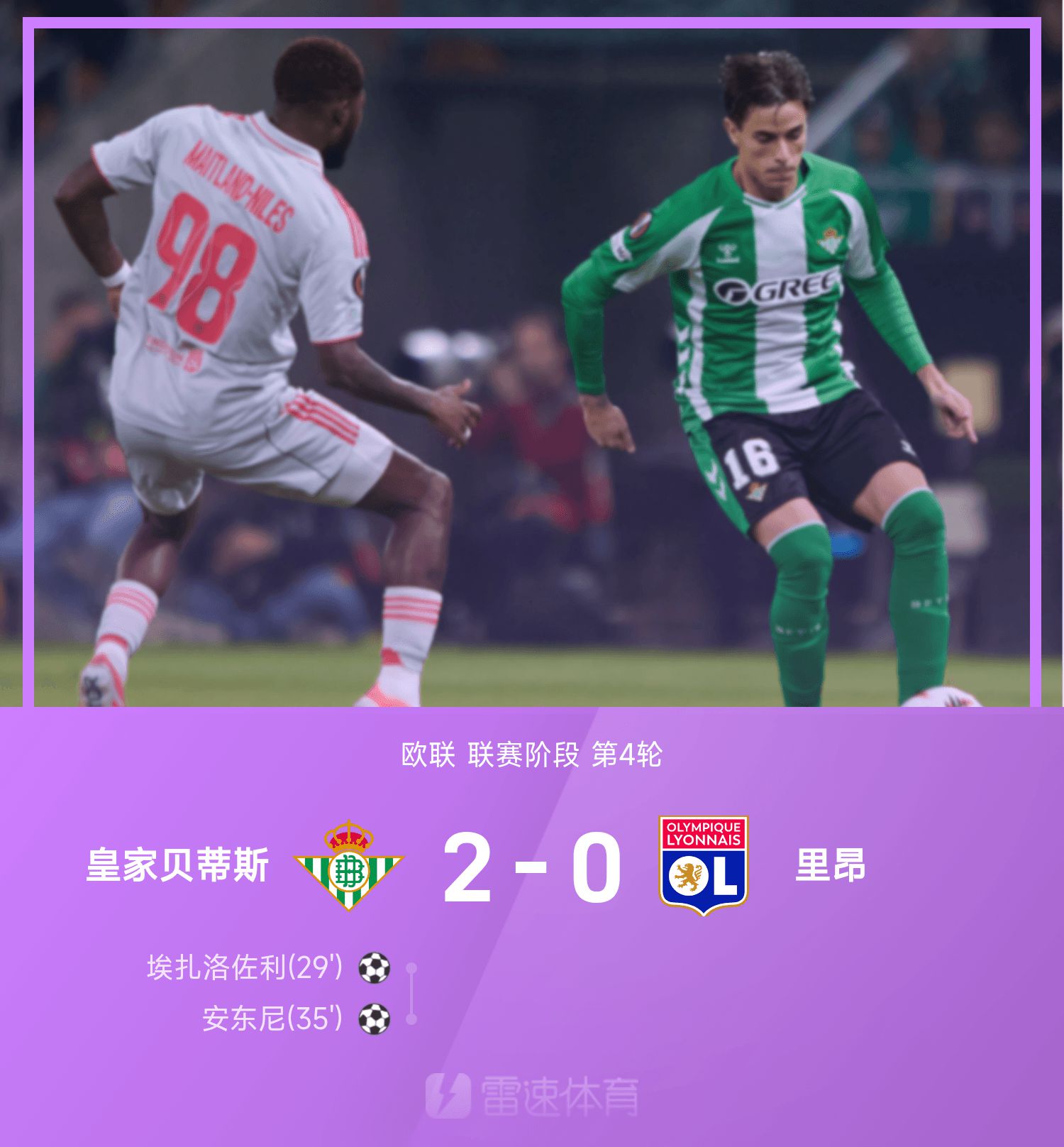 6686体育官网11月07日讯 25/26赛季欧联联赛事阶段第4轮,皇家贝蒂斯对阵里昂。上半场第29分钟,巴坎布助攻埃扎洛佐利抢点破门,皇家贝蒂斯先拔头筹。第35分钟,罗卡自由球起大脚传,安东尼形成单刀冷静调射将赛果分改写成2-0。下半场两队均无建树,最终皇家贝蒂斯在主队场以2-0击败里昂。