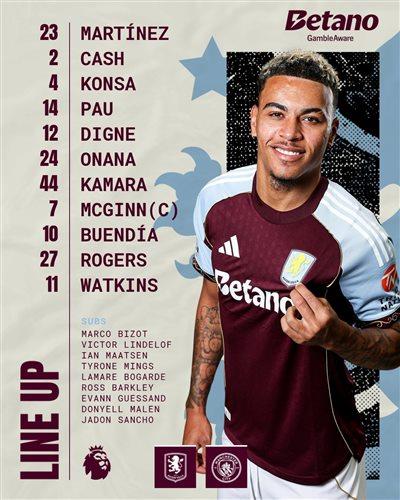 阿斯顿维拉首发阵容:23-马丁内斯、12-迪涅、4-孔萨、2-卡什、14-托雷斯、7-麦金、10-布恩迪亚、44-卡马拉、24-奥纳纳、27-罗杰斯、11-沃特金斯