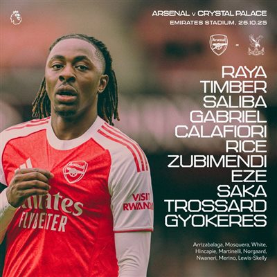 6686体育官网10月26日讯 英超联赛事第9轮,阿森纳主队场迎战水晶宫。赛前,两队首发阵容出炉。