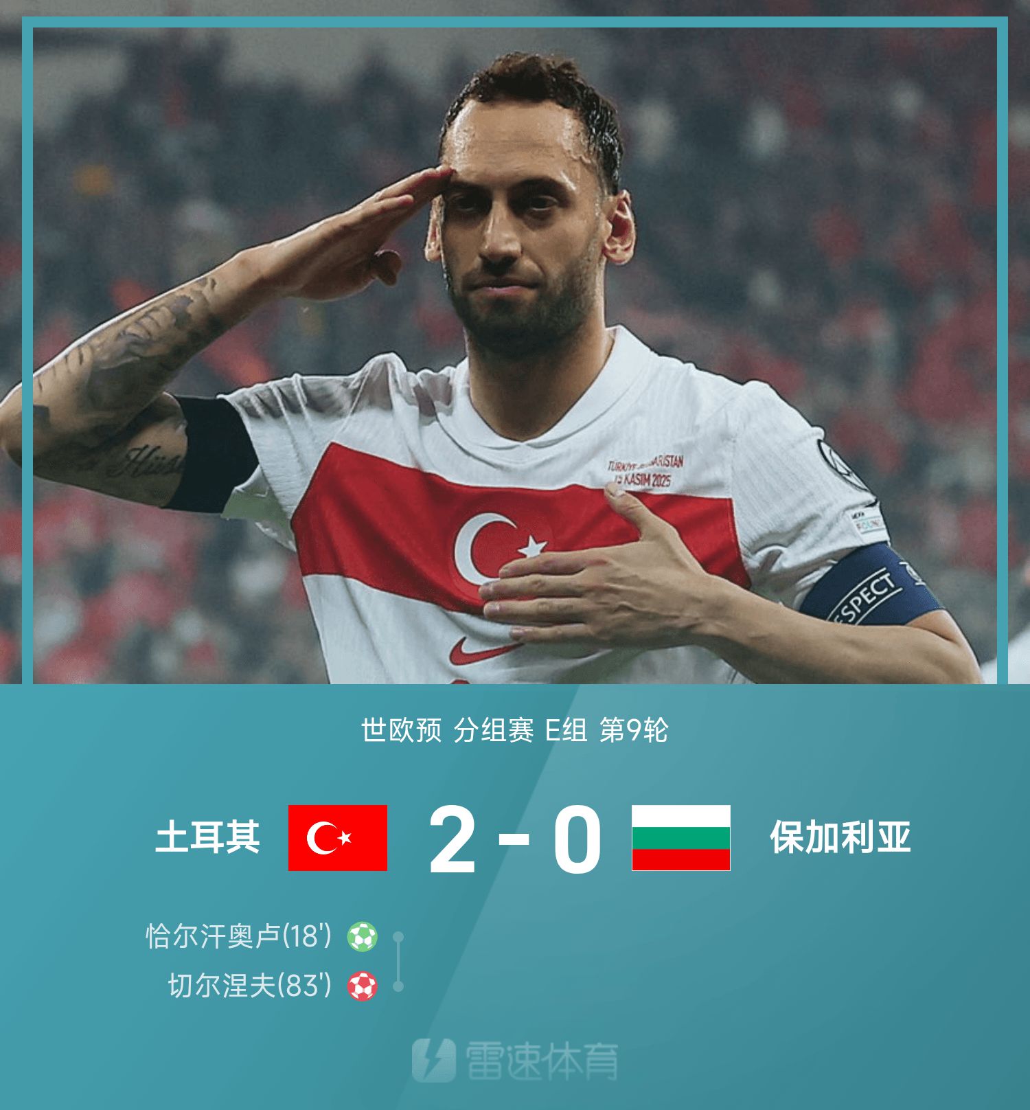 6686体育官网11月16日讯 26赛季世欧预分组赛E组第9轮,土耳其2-0战胜保加利亚。上半场竞赛,恰尔汗奥卢点射破门,下半场切尔涅夫自摆乌龙,协助土耳其力克对手。