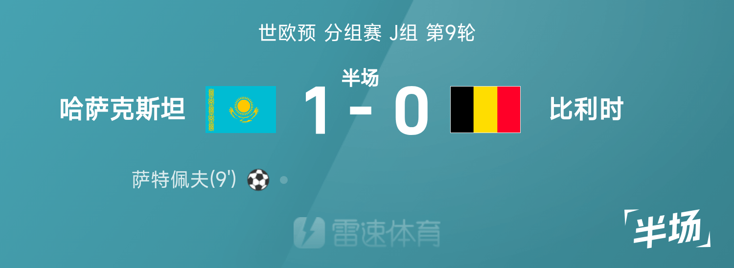 世欧预半场:萨特佩夫建功,哈萨克斯坦暂1-0比利时