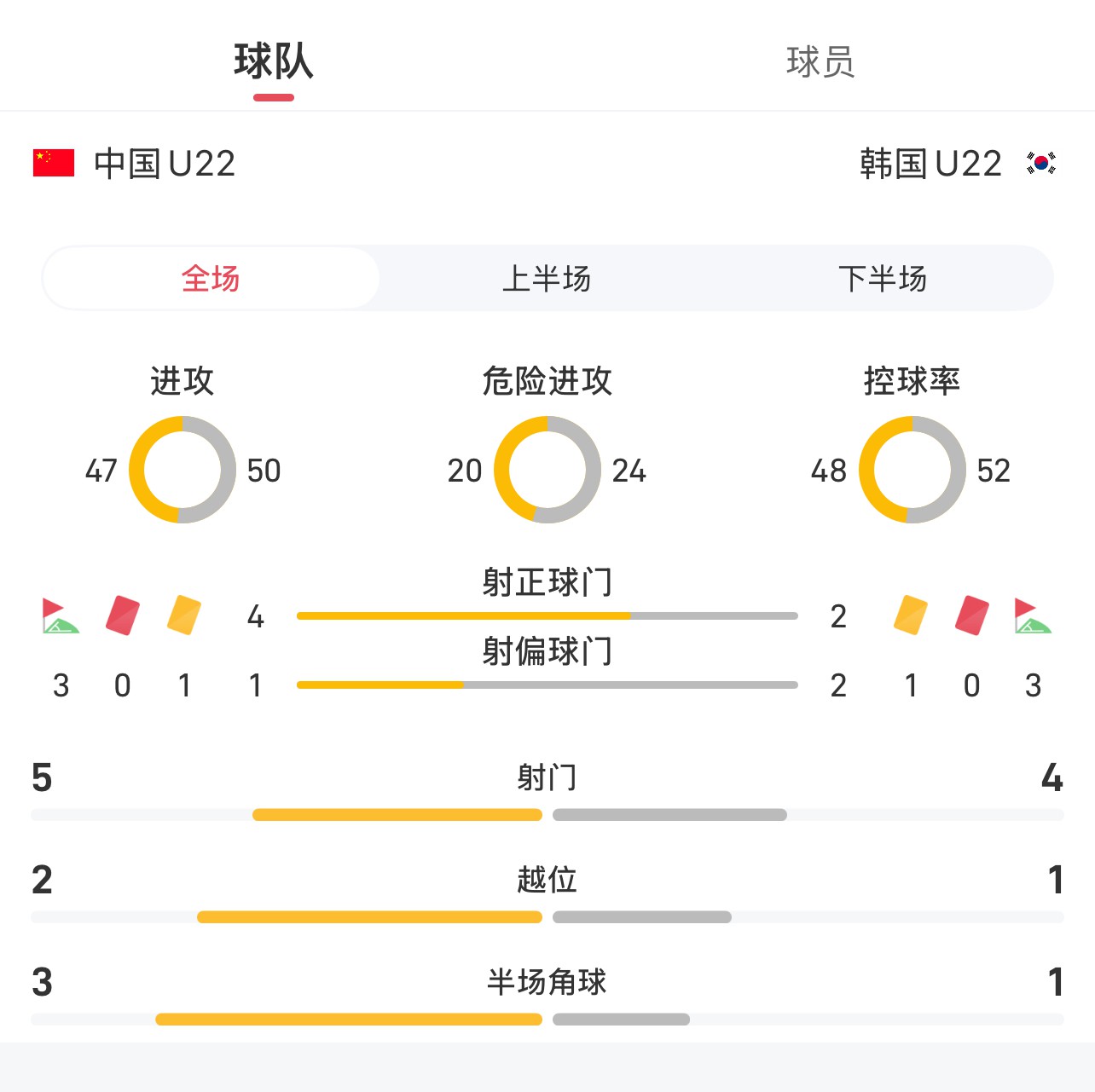 熊猫杯U22中国vs韩国全场数据:打门5-4,盘球率五五开