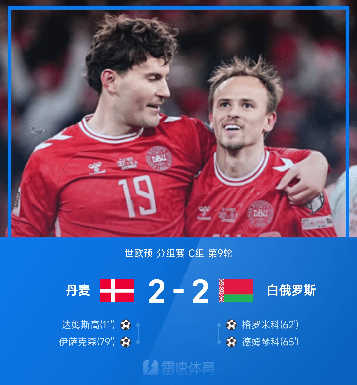 6686体育官网11月16日讯 26赛季世欧预分组赛C组第9轮,丹麦对阵白俄罗斯。第11分钟,达姆斯高三秒区外轰出超级世界波,丹麦取得梦幻开局。下半时风云突变,白俄罗斯在第62分钟和第65分钟运用格罗米科的传射建功,瞬间将赛果分逆转局为2-1。第79分钟,多尔古传禁区,伊萨克森爆射破门,两队再度回到同一出发线。最终丹麦在主队场以2-2战平白俄罗斯,由于同组的苏格兰作客不敌希腊,丹麦仍然占据直接晋级世杯赛总决赛圈的优势位置。