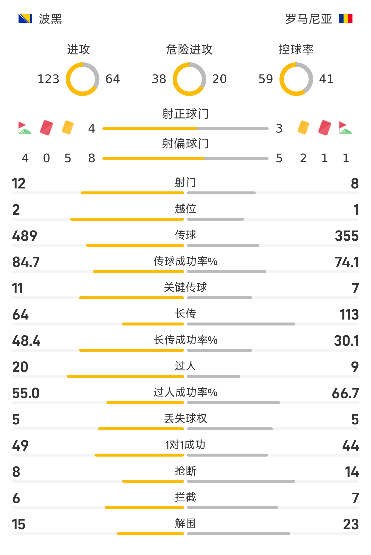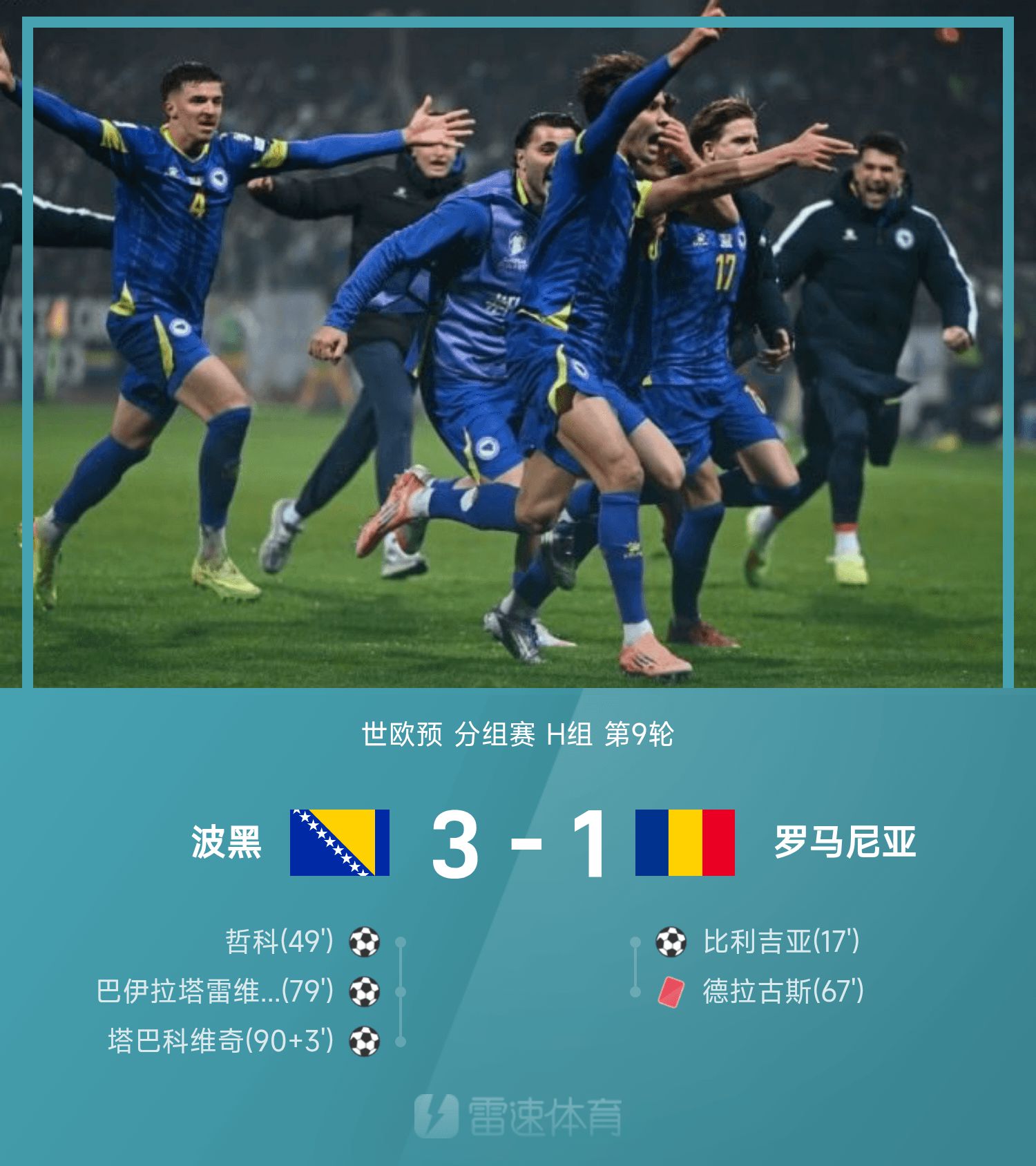 6686体育官网11月16日讯 26赛季世欧预分组赛H组第9轮,波黑坐镇主队场迎战罗马尼亚。上半场,罗马尼亚梦幻开局,比利吉亚破门建功。下半场,波黑开端发力,哲科破守门员赛果分扳平。德拉古斯上场两分球钟严重违例染红罚下,罗马尼亚十人应战波黑。第79分钟,巴伊拉塔雷维奇世界波破门逆转局,塔巴科维奇破门锁定战局。比利吉亚破门难救主。最终,波黑3-1战胜十人罗马尼亚。