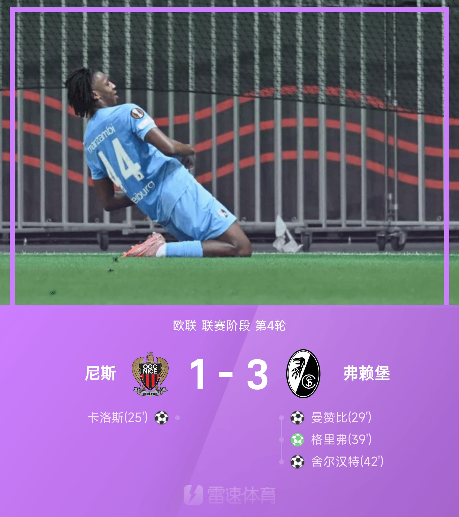 欧联战报:格里弗点射,舍尔汉特建功,弗赖堡3-1尼斯