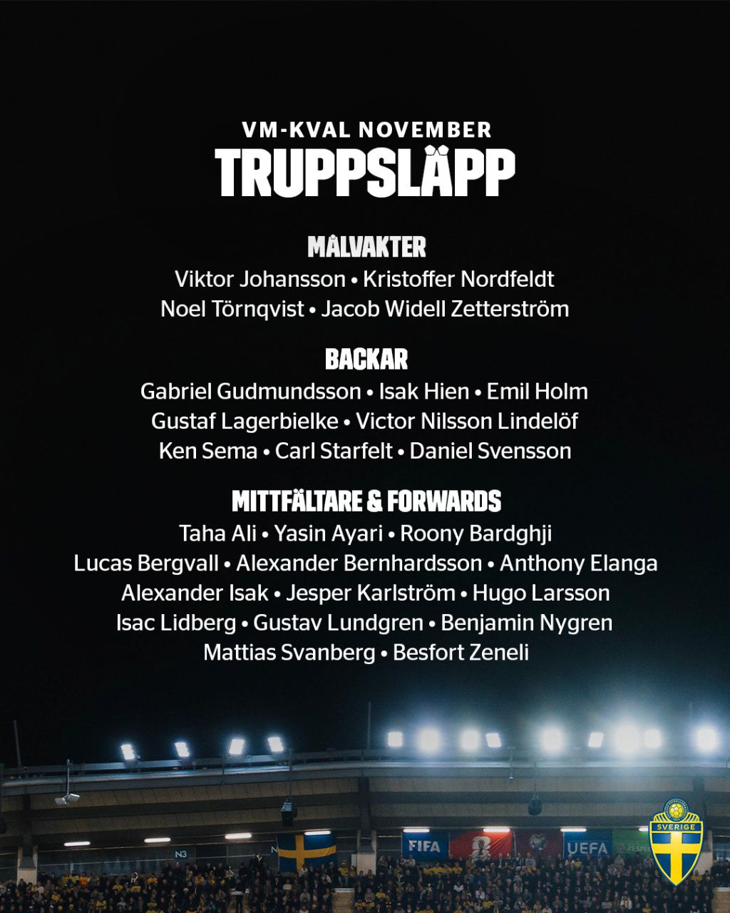 后防线:丹尼尔·斯文松(多特蒙德)、希恩(亚特兰大)、古德蒙德森(利兹联)、拉格比尔克(布拉加)、塞玛(帕福斯FC)、霍尔姆(博洛尼亚)、林德洛夫(阿斯顿维拉)、斯塔费尔特(塞尔塔)