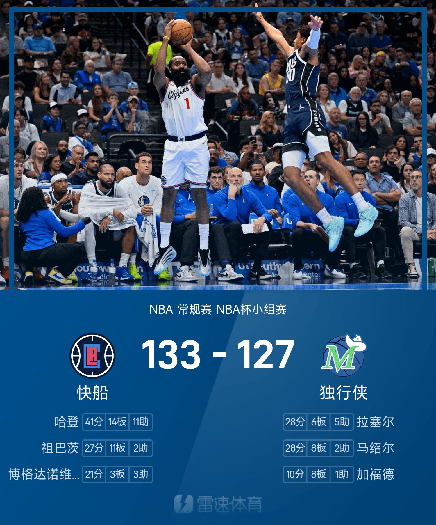 6686体育官网11月15日讯 25/26赛季NBA 常规赛 NBA杯分组赛,独行侠对阵快船。双方全场战罢,独行侠127-133不敌快船。哈登砍下全场最高的41分14板11助,率领快船胜利取胜。