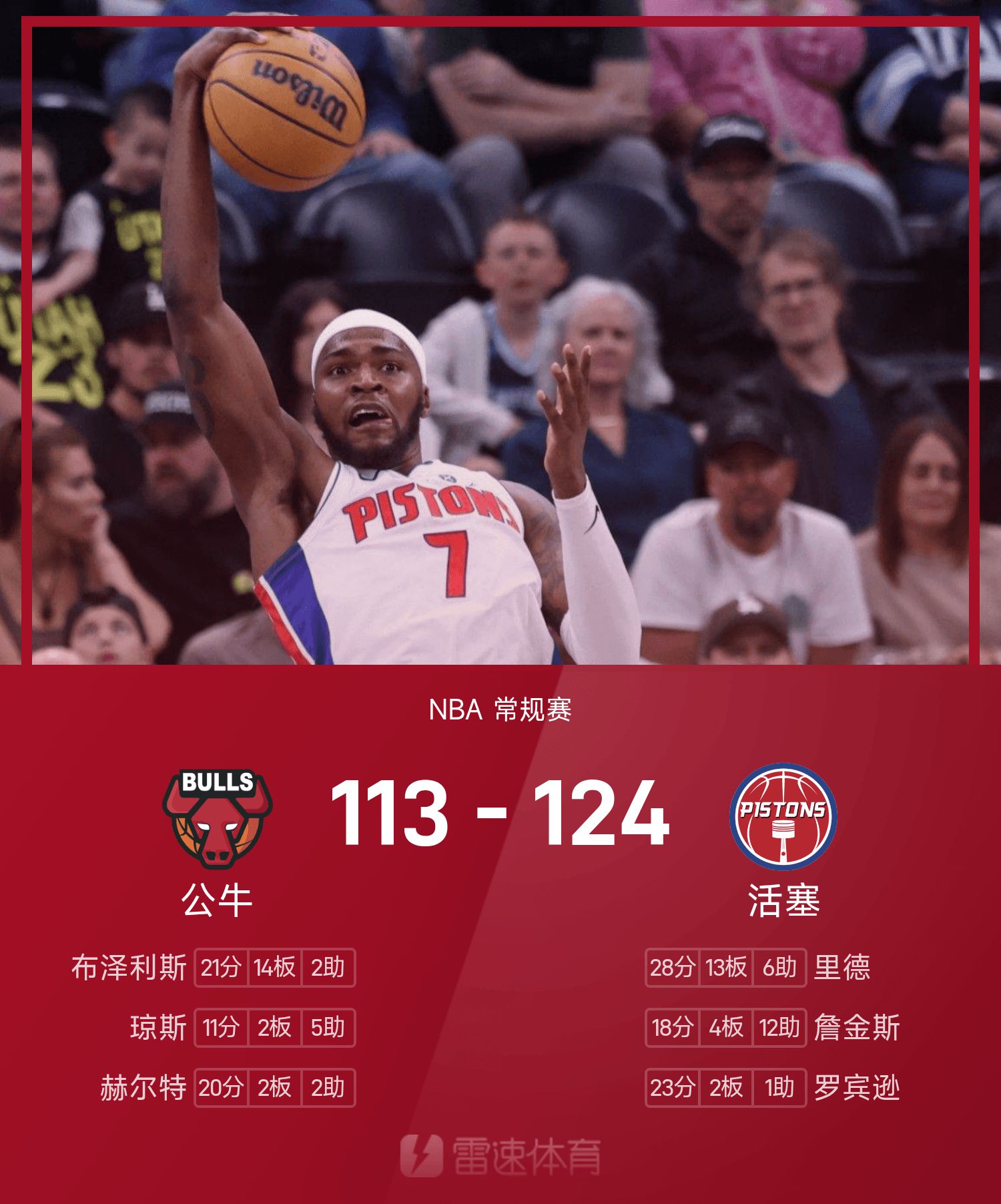 NBA战报:里德28分12板6助,活塞124-113击败公牛