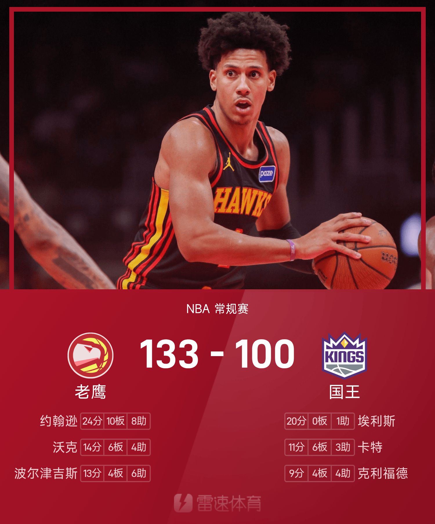 NBA战报:约翰逊24分10板8助,老鹰133-100狂胜国王