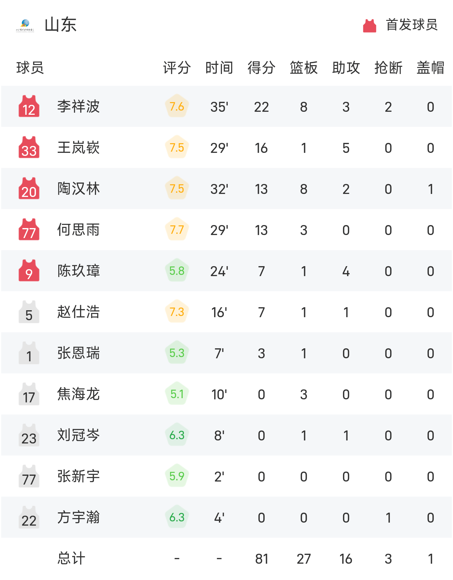 6686体育官网11月06日讯 全运男篮分组赛,浙江对阵山东。双方全场战罢,浙江85-81战胜山东。余嘉豪得到18分9板1助率队取胜,李祥波空砍全场最高的22分8板3助。