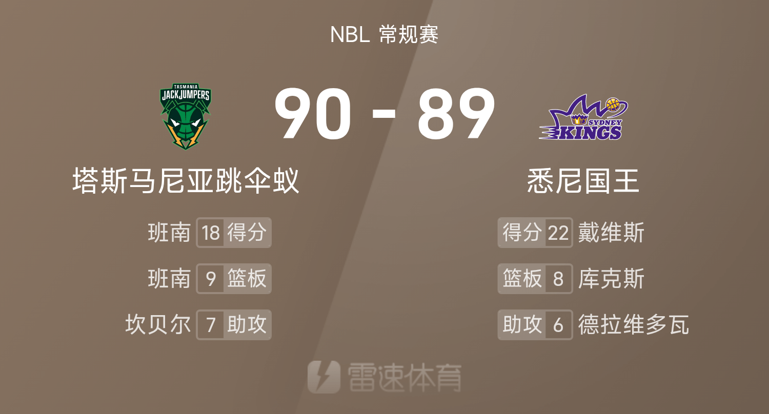 6686体育官网10月26日讯 25/26赛季NBL 常规赛,悉尼国王对阵塔斯马尼亚跳伞蚁。双方全场战罢,悉尼国王89-90不敌塔斯马尼亚跳伞蚁。班南得到18分9板2助率队取胜,戴维斯空砍全场最高的22分6板5助。