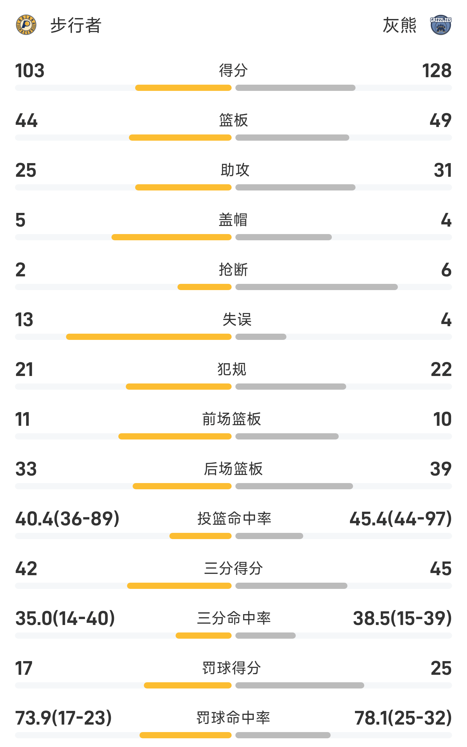 双方全场战罢,灰熊128-103战胜步行者。